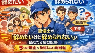 整備士 転職で「辞めたいけど辞められない」と悩む人へ。辞められない理由の整理、職場を変えずに楽になる方法、転職準備の手順、副業・社内キャリアチェンジまで、整備士の選択肢を一つずつ具体的に解説するピラー記事です。