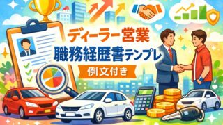 ディーラー営業向け職務経歴書テンプレを掲載。販売台数ではなく「顧客基盤・再現性」で評価される書き方、業界別の言い換え例、NG→改善例まで解説。