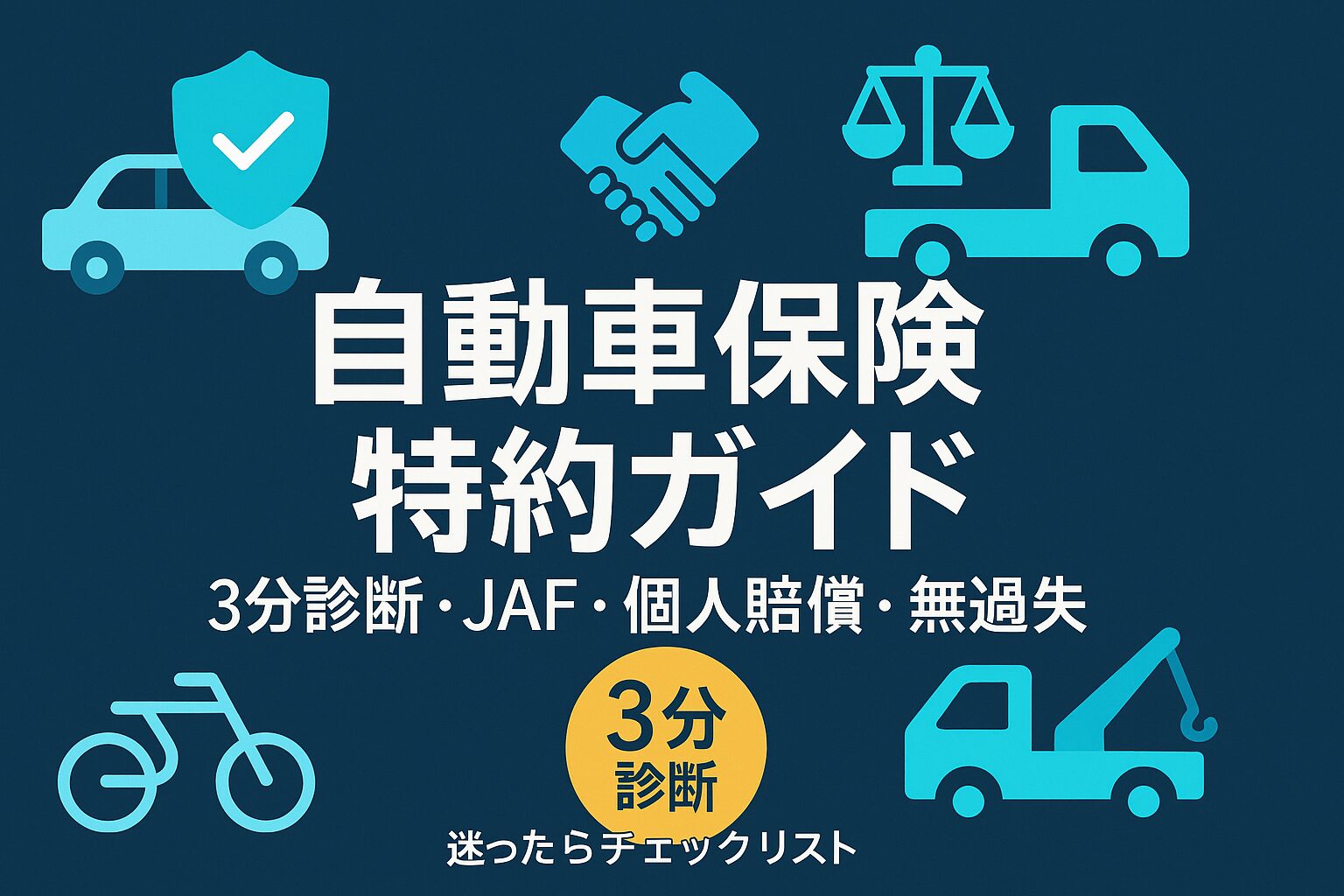 でも大丈夫。“実際に起こりやすい場面”に照らして、重複なく・ムダなく・必要十分を狙えば迷いは一気に解けます。この記事は、3分で自分の最適セットを見極めるチェックポイントを提示し、JAFとロードの違い、個人賠償特約の示談交渉付き、**車両無過失事故特約(無過失特則)**まで正しく整理します。